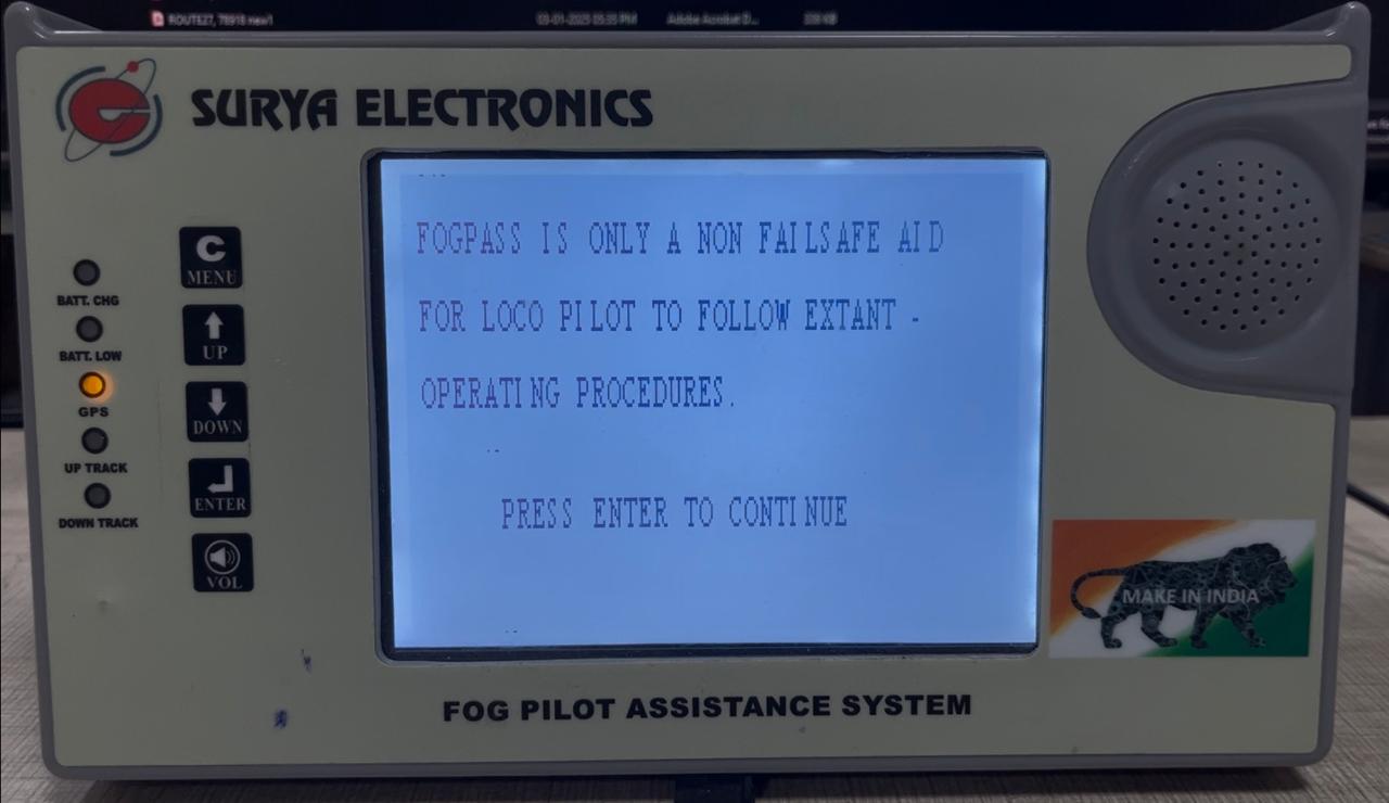 FogPASS is a safety-critical electronic system that assists loco pilots in navigating dense fog conditions. Using GPS positioning and pre-loaded track data, FogPASS provides real-time speed advisories and signal information โ dramatically reducing fog-related accidents.